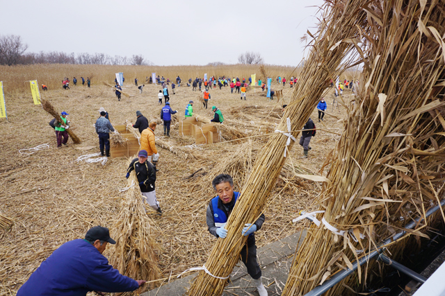 【東近江】東近江市伊庭町の伊庭内湖沿いに広がるヨシ群で17日、この時期の風物詩となるヨシ刈りが行われた。地元の有志らで構成される伊庭の里湖(さとうみ)づくり協議会が主催し、地元自治会や協賛企業、一般ボランティアなど約250人が参加。高さ4メートルほどに成長したヨシを鎌などで刈り取り、長さを整えて束にするなど約2時間、作業に汗を流した。ヨシは琵琶湖の水質浄化に役立ち、刈り取ることで良質なヨシ群の維持につながっている。同協議会の村田八佐夫会長は「昨年の手入れが良かったのか、今年は丈夫なヨシができた。町内にある神社の茅葺きの屋根の改修などに使用できれば」と話した。