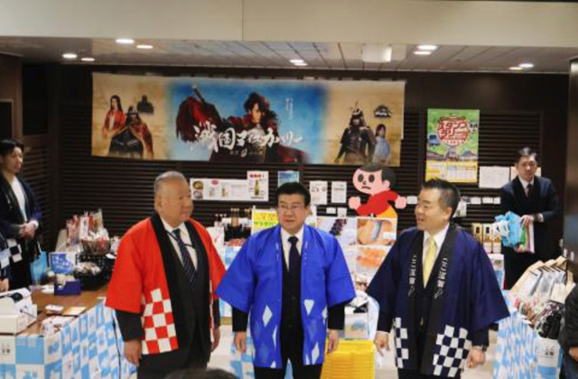 これに関連して、三日月大造知事と西武ホールディングスの西山隆一郎社長、近江鉄道の藤井高明社長が18日、首都圏一極集中が進むなか、西武創業者出身の地である滋賀県への誘客促進に向けて、特産品の赤こんにゃくなどのトップセールスを池袋駅・物産ブースで行い、首都圏の利用客に滋賀県の魅力をアピールした。