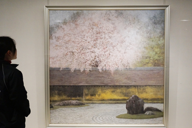 会場では冬の作品、春の作品を分けて紹介。滋賀の原風景が残る湖北地方や湖畔の風景を題材にした作品のほか、自然が織りなす四季を背景に富士山を描いた『富嶽四題 春 兆』、京都市左京区にある龍安寺の石庭と満開の桜を描いた中路氏最後の日展出品作品『淡江垂咲く石庭』など、冬から春に季節が移り変わる様子を表現した代表的な作品など18点を展示している。