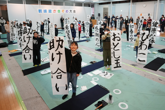 張りつめた緊張感の中、参加者は学年別に指定された課題を正しい所作で書き上げ、20分間で2枚を仕上げた。参加した畑寿美さん(小3)は「しっかり書けてうれしい」と笑顔で話した。優秀賞作品はあす28日観峰館ホームページで発表され、1月31日、2月1日には同館で作品が展示される。