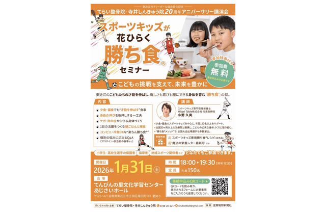 スポーツキッズ専門管理栄養士の小野久実さんを講師に招き、小食・偏食でも才能を伸ばす食事や、身長の伸びを後押しする一工夫、けが・熱中症から守る身体づくり、1日の活躍をつくる朝ご飯・補食などが伝えられる。