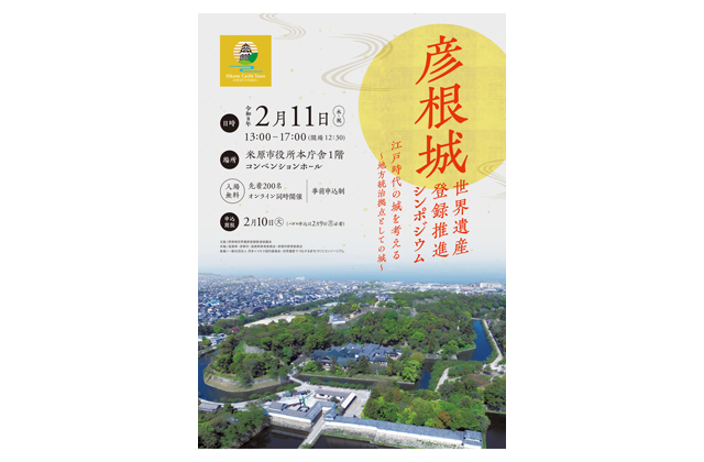 【彦根】 彦根城の世界遺産登録推進シンポジウムが2月11日午後1時から、「江戸時代の城を考える~地方統治拠点としての城~」をテーマに米原市役所本庁舎1階コンベンションホールで開催される。