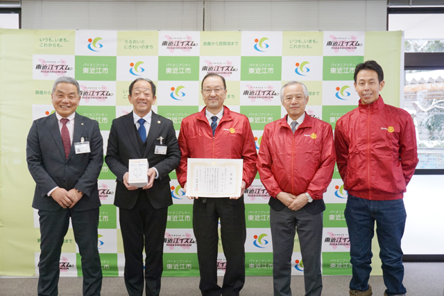 【東近江】 東近江ロータリークラブは26日、東近江市へ「スポーツ振興に役立ててほしい」と元WBC日本代表監督の栗山英樹氏を招いて先月21日に八日市文芸会館で実施した特別記念講演で集まった募金6万410円を寄付した。