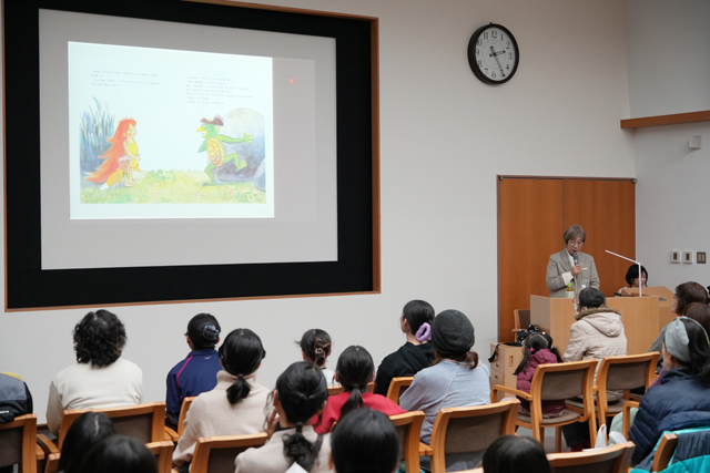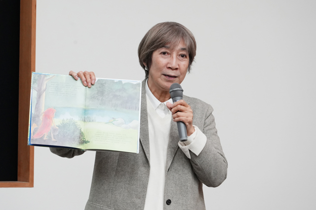 「物語は人を楽しませるホラのようなもの」と、創作の原点ともなる幼少期に家族から聞いた妖怪の話を挙げ、最後に、父の死をきっかけに生まれた絵本『さくらの谷』を読み聞かせ、会場を感動に包んだ。