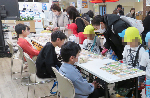 【東近江】 八日市北小学校の知的特別支援学級「すみれ学級」(13人)の児童がこのほど、年間を通じて目標や課題に沿って取り組む生活単元学習の一環として、牛乳パックからつくったはがきやメッセージカードなどを販売する「すみれマルシェ」をショッピングプラザアピア4階で開いた。この日は、保護者のほか、同小学校近くの建部幼稚園の園児や、一般の買い物客ら約100人が訪れた。