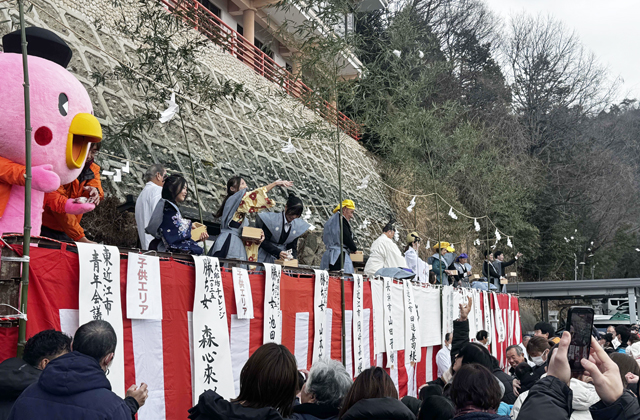 【東近江】 招福神事の節分厄除大祭が1日、太郎坊宮(東近江市小脇町)で執り行われた。2月第1日曜日に行われる恒例行事で、今年も福男・福女による福餅と福豆まきを実施した。大勢の参拝者らが押し寄せ、福を持ち帰った。