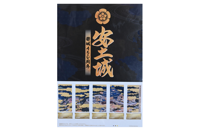 下部に110円切手5枚を配置し、上部に織田信長の家紋と「安土城 築城450周年」の筆文字が印刷されたデザインで、「安土城」の文字は、江州音頭祭文家の深尾勝義さん(82)の筆。
