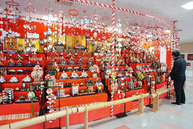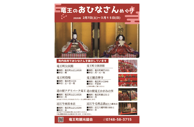 竜王町公民館、竜王町立図書館、竜王町役場、竜王観音禅寺、道の駅アグリパーク竜王、道の駅竜王かがみの里、近江牛岡喜本店、近江牛毛利志満近江八幡本店の8カ所で豪華絢爛なひな人形を展示する。