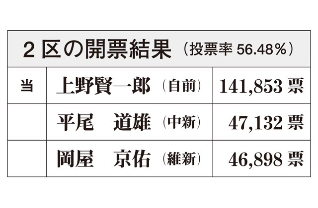 【東近江など】 衆院選の投開票が8日にあり、県内小選挙区全ての議席を自民が確保。3人が立候補した滋賀2区(彦根、長浜、近江八幡、東近江、米原など)では、自民前職の上野賢一郎氏(60)が当選を果たし、中道新人の平尾道雄氏(75)、維新新人の岡屋京佑氏(33)を寄せ付けず自身国政7期目を決めた。