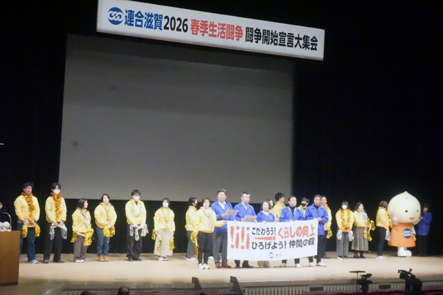 【全県】 日本労働組合総連合会滋賀県連合会(連合滋賀、大津市松本2)が7日、大津市民会館(同市島の関)で「連合滋賀2026春季生活闘争開始宣言大集会」を開催し、「こだわろう!くらしの向上 ひろげよう!仲間の輪」をスローガンに集った組合員ら約1200人が気勢を上げた。