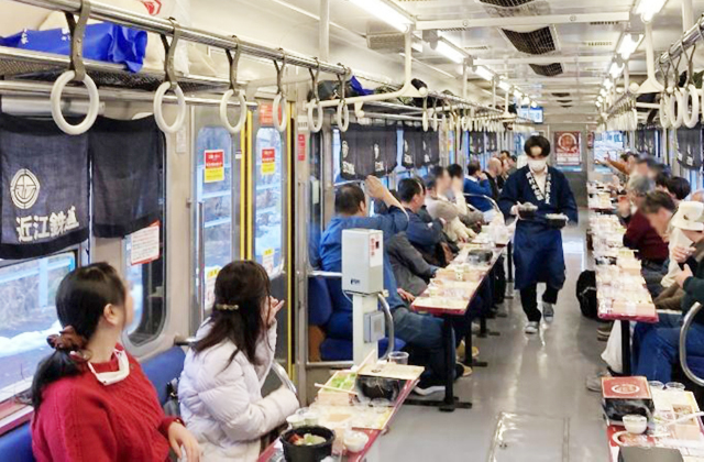 【彦根】 近江鉄道は、貸切電車内で滋賀の地酒や地元食材を楽しめる「近江の地酒電車2026」の申し込みをウェブサイトで受け付けている。