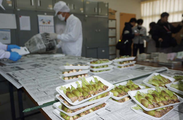 東近江市山上町の出荷作業所では13日、JAグリーン近江の「永源寺タラの芽生産部会」(11軒)の会員が、早朝に収穫したばかりのタラの芽を規格ごとに選別し、パック詰めの作業を行っていた。