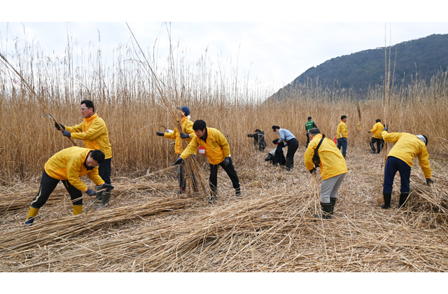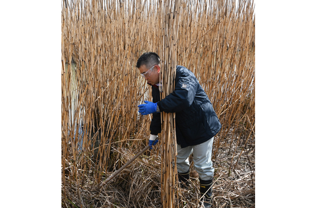 ヨシ刈作業は、11班のグループで進められ、各班ごとの持ち場に分かれて高さ3メートル余りに育ったヨシをノコギリ鎌で刈り取っていった。