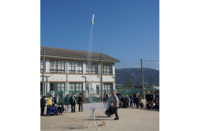 ロケットは長さ約60センチで、本物と同じ原理で火薬で飛ぶ。グラウンドに設置された発射台にロケットを取り付け、下級生が見守る中でカウントダウンに合わせてスイッチを押すと、ロケットは白煙をはきながら、高さ15~20メートルほど青空に向かって飛び立った。