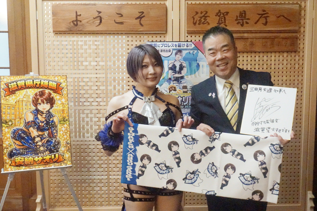 【大津】 唯一の県出身現役女子プロレスラーの安納サオリ選手(スターダム所属)が20日、今年3月で閉館する県立体育館「ウカルちゃんアリーナ」(大津市におの浜4)で開催された凱旋興業「STARDOM in OTSU 2026 Feb.~ありがとうウカルちゃんアリーナ 私がスターダムの安納サオリです~」に出場。試合の前日には県庁で三日月大造知事を表敬訪問し、ウカルちゃんアリーナや地元・滋賀への熱い思いを語った。