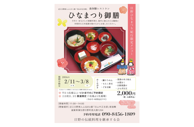 【日野】 開催中の「日野ひなまつり紀行」(3月8日まで)に合わせ、近江日野商人ふるさと館「旧山中正吉邸」(日野町西大路)の食体験レストランで「ひなまつり御膳」(1人前2千円、入館料含む)が提供されている。