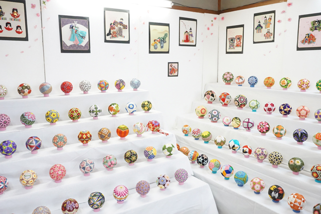 今回は新たに、日野商人西村市郎上衛門家より預けられた同家伝来の「越ヶ谷びな(埼玉)」(江戸期)を玄関口に展示し、室内では同町大窪在住の竹村ウメさん(85)作の手まり約300点を並べており、一層華やかな会場で来場者の目を楽しませている。