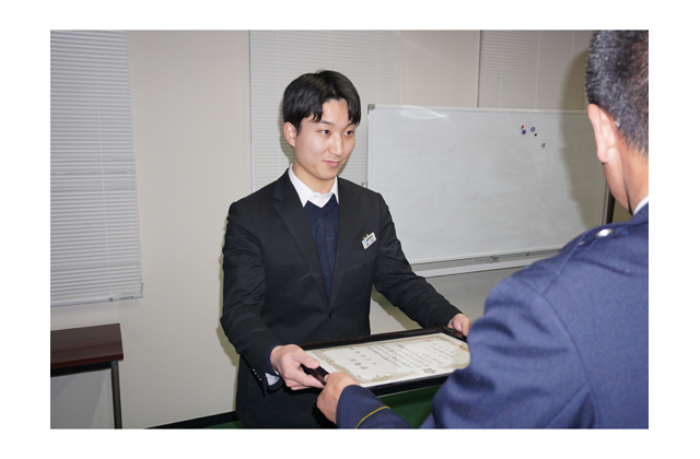 【東近江】 来店した顧客の詐欺被害を未然に防いだとして東近江警察署はこのほど、滋賀銀行日野支店の行員、永山嵩都さん(23)に署長感謝状を贈った。