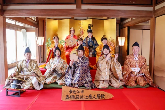 今年も東近江市の観光大使「レインボー大使」の寺井美音さん(20)と伊谷美心菜さん(20)がお雛様とお内裏様になりきり、三人官女と五人囃子(ばやし)は公募で選ばれた高校生から60代の8人が務めた。