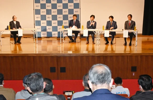 4氏が順番に市長選立候補の決意表明をした後「若者・子育て世代のテーマ」、「地域経済、観光と生活の両立」、「財政運営と優先順位」の3つのテーマについて、4氏がそれぞれの考え方や市政の取組みなどの意見を述べた後、各氏が1問1答で発言し、主張(制限時間2分)に耳を傾けた。