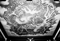 墨一色で描かれた天井画には、雷を鳴りとどろかして荒れ狂う「雲龍」のほか、「いだ天」、「八大竜王」、「天女」が乱舞し、仏教の思想を表現している。