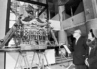 若者の祭り離れと高齢化で担ぎ手を失い、長年社殿に保存されたままとなっていた五個荘町清水鼻の繖(きぬがさ)山山麓、日枝神社の神輿(みこし)が、このほど四十五年ぶりに里に降りた。 同町てんびんの里文化学習センターロビーにて三月五日まで展示されている。