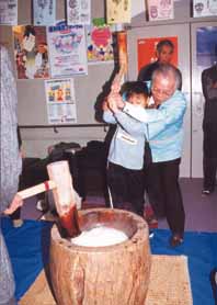 メインの『おもちつき大会』では、社協職員や一般ボランティアらの協力のもと参加者らが順に杵(きね)を持ってペッタン、ペッタン。つきあがった餅は温かいぜんざいやきなこ餅などにして振る舞われ、参加した子どもたちは自らがついた餅に笑顔で舌鼓を打っていた。
