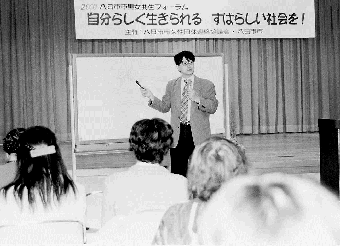フォーラムでは、中村正立命館大産業社会学部助教授による講演「『あなたらしさ』の発見!=男らしさをつくってきた性別役割に気づいて 自分らしさを=」で、社会や文化の中でつくられてきた「男らしさ」「女らしさ」などの性差“ジェンダー”による不平等をなくすことや、男性も子どもの出産や育児に積極的に参加することの重要性、そのための父親教育の必要性を学んだ。
