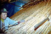 十年程前まで農村で多く見られていたヨシ葺き民家は、耐久性に優れる上、夏は涼しく、冬は暖かい特性を持つ。今では需要が減り、限られた業者が技術を持つだけ。
