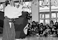 この日のふれあい保育では、最近ではめったに見れなくなった獅子舞が講堂で公演され、招待された保護者や地元のお年寄りも一緒に鑑賞した。