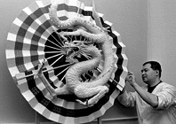 全体の大きさは直径1メートル15センチで本物の2分の1。扇は道明粉と水飴、いら粉、食紅、竜は白あんと餅を練り合わせて胴部分を成形し、約1,300枚余りのウロコを1枚1枚枚丁寧に貼り付けた。赤い目は飴、口はガムでできている。制作した野村さんは「乾燥すると縮む計算を入れて作るのに苦労しました」と話している。