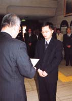 八日市市役所で昨年九月から行政研修していた友好都市・中国湖南省常徳市の袁宏さん(34)の修了式が、三日に同市役所一階ロビーで行われ、市民や市職員ら約百人が見守った。袁さんは昨年九月から半年間、役所内の各部署に出向いて日本の行政システムを学んできた。