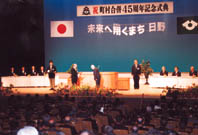 日野町の町村合併四十五周年式典が、このほどわたむきホール虹で開かれ、近隣市町の行政関係者、友好都市提携を結ぶ韓国・恩山面とブラジル・エンブ市の代表、住民の約三百人が出席し、町行政のこれまでの歩みを振り返った。