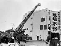 訓練には、はしご車や化学車など三台と、消防と救急の隊員十一人が出動。煙がたちこめる中での救出、はしご車による屋上からの救出、消火、現場に設置された応急救護所での救急救命士による負傷者の応急手当などを行った。