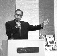 壇上に飾られた在りし日の写真に深々と頭を下げ、共に歩んできた三十年を振り返りながら「お世話になった。一貫して温かい激励と叱責を頂戴した」と、井田さんの活躍と人柄をたたえた。