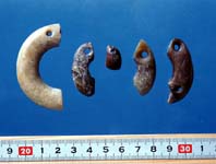 県教委は三十日、県営土地改良事業に伴い発掘調査を行った安土町下豊浦の弁天島遺跡から約六千年前のけつ状耳飾(けつじょうみみかざり)五個を新たに発見し、これまでの調査と合わせた出土数は計十一個にもなる西日本で最大量が出土した、と発表した。