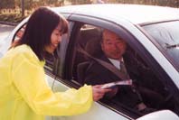 蒲生町役場前では、交通安全協会のメンバーたちが「交通ホウキ 皆で守って 事故はなし」をスローガンに、通勤途中のサラリーマンにミニホウキを手渡し、「ルールを守って交通安全を心がけてください」と呼びかけていた。受け取ったドライバーは「ありがとう」とニッコリしながら、交通マナー向上を誓っていた。