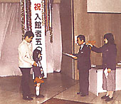 思わぬ歓迎を受けた沙希子ちゃんは、ビックリしたものの大喜び。石田勝館長から五十万人目の入館者を証した「認定書」と信長兜やオリジナルテレフォンカードなどたくさんの記念品を贈られた。