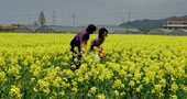 真っ青な空の下、緑広がる田園風景に浮かび上がる鮮やかな黄色い菜の花畑。愛東町の菜の花からとった食用油の廃油を燃料として利用する取り組み「菜の花エコプロジェクト企画」に向けて栽培している菜の花が満開を迎え、取り組みの一環として菜の花の摘み取りとフォトコンテストが始まった。