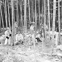 午前九時から作業をはじめ間伐や草刈りのほか、子供らが体験する竹炭づくりにと間引いた竹を長さ一・五メートルに切り用意した。午後からは掘ったタケノコの天ぷらで舌鼓を打ちながら、心地よい汗をぬぐい公園活用の話に花を咲かせた。