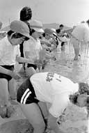 八日市市立八日市南小学校二年生百二十七人が十日に県立八日市南高校を訪れ、高校生のおにいちゃん、おねえちゃんに手伝ってもらいながら、サツマイモの苗を植えた。