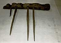 今回出土した馬鍬は、台木の長さが七十センチ、歯は根元だけのものが四本、完全なものが三本残り、長さは最長で約五十三センチ。歯の断面は三角形に近く、進行方向がとがっている。台木の材質はヒノキ類、歯は固いカシ類と見られ、全体を復元すると幅約一メートル、歯の数は計十二本となる。