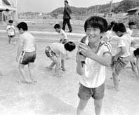 合図とともに体操服姿で一斉にプールに飛び込んだ児童たちは、きらきらと輝く水しぶきを浴びながら懸命にコイを追いかけ、捕まえたコイを手に笑顔をほころばせていた。