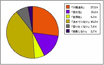 それによれば一区の支持率では、民主前職の川端達夫候補が、自民前職の目片信候補を約倍、共産新人の吉原稔候補を五倍近く引き離している。また前回(昨年十二月調査)に比べると、川端候補は順調に比率を伸ばしているが、吉原候補は微増、目片候補は横ばいである。