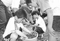 児童たちは泥んこになりながらも、バケツの中の雑草を取り除き、育った苗を丁寧に抜き取り、太く、大きく、元気に育っている苗を選び、土に肥料を加えて、選んだ苗をバケツ中央に植え直し、二十個のバケツの「田植え」作業が完了。