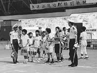 小学生を対象にした「登下校時の旗振り指導」では、近江八幡署員と交通安全協会会員が、横断歩道での安全な渡り方についてアドバイスしていた。子どもたちは、模擬自動車が停車するのをしっかり確認してから、班長の誘導に従って素早く横断し、ドライバーへのお辞儀を忘れずにしていた。