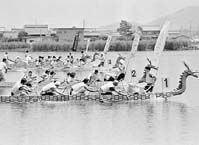 ことしも県内外から、性別不問の『ヤングドラゴン杯』に七十二チーム、女性中心の『ミスドラゴン杯』に十八チームの計九十チームがエントリー。勇ましい龍の姿をかたどったカヌーに一チーム十人が乗り込んで、伊庭内湖に特設された往復三百メートルのコースを滑るように駆け抜けた。
