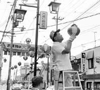 観光協会、市商工会議所、市役所など関係者が十七・十八日の両日、江州音頭総おどり(二十七日午後八時開催)の会場となる金屋大通りから近江鉄道新八日市駅までと、延命花火大会(二十八日午後八時開催)や子どもの広場(二十九日午後六時開催)の会場となる八日市駅前周辺(ピアシティー)に、約五千個のちょうちんを取り付ける作業を行った。