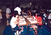 ことしも子どもたちの手により、一人三~七枚のペースで粘土版にさまざまな図案や絵柄が竹ペンや指を使って次々と書き込まれていった。