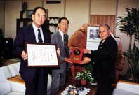 五個荘町金堂の「金堂町並み保存会」(西村實会長)は、八月一~七日の観光週間にちなみ、社団法人日本観光協会関西支部(金馬昭郎支部長)から表彰および感謝状を贈呈され、このほど役場町長室で受賞式の報告を行った。